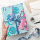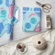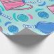 Moda y papel de envoltura colorido para envolver regalos de pickleball. El diseño tiene paletas y bolas de pelotas azules con algunas paletas en una bolsa rosa de cuerda floja. El diseño de pickleball se puede encontrar en otros artículos de mi tienda, PageCreativeDesigns.