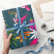 Papel de envolver colorido de la selva tropical húmeda. Hummingbirds rosa y morado volando sobre un fondo tropical. Palmeras y flores. Fondo azul verde azulado oscuro.