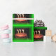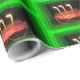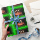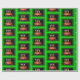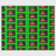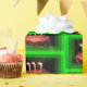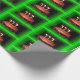 Una toma de un papel de preparación de pasteles de cumpleaños que es brillante y colorido. Con un marco verde alrededor de un Pastel con tres Velas en llamas. Eso es en Wrapping PAPER.