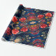 Un sofisticado papel de envoltura con amapolas rojas naranjas y remolinos azules y algunos elementos geométricos. Diseñado por Alexandra Cook, alias Linandara, para un brillante futuro feliz.