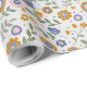 Patrón Boho 01.w. Esta imagen es un patrón sin fisuras que presenta un vibrante diseño floral boho. El patrón se compone de varias flores estilizadas en tonos azules, amarillos y naranjas, intercaladas con hojas y pequeños puntos. El fondo es de un blanco sencillo, lo que permite destacar las flores de colores. La estética general es alegre y lúdica. Los detalles intrincados de los elementos florales crean una sensación de profundidad y textura, añadiendo interés visual. El uso de colores contrastantes añade vitalidad y hace que el patrón sea visualmente atractivo.