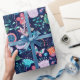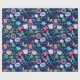 Flores exóticas coloridas con una textura brillante en un patrón sin fisuras sobre fondo azul oscuro.
