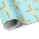 Patrón de temática cristiana con fondo azul verde azulado claro y cruces falsas de Relieve metalizado de oro.