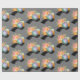 Papel envuelto con un ilustracion acuarela de una cámara naranja con un ramo de flores y una tira de película ondulada en blanco y negro.