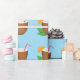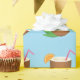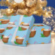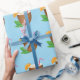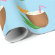 Ilustracion personalizado dulce de una bebida tropical de coco. La bebida se compone de un delicioso coco marrón, una paja rosada y una tajada de un naranja. También hay dos hojas verdes bajo el coco. El color de fondo es azul.