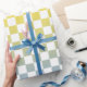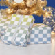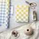 El degradado moderno amarillo a azul claro y el patrón de cuadros blancos le dan un acento colorido a sus regalos. Los cuadrados de color cambian gradualmente de amarillo brillante a azul ceruleano al lado de los cuadrados blancos. Para ver el diseño geométrico de ombré en otros elementos, pulse el enlace "Rocklawn Arts". © Claire E. Skinner, todos los derechos reservados.