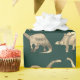 Papel de envoltura verde con patrón de dinosaurio. El diseño de dino perfecto para llevar la diversión de los dinosaurios a cualquier cumpleaños. T-Rex, velociraptor, stegosaurus, pterodáctilo, triceratops, brachiosaurus y brontosauro en tonos marrones fríos sobre un fondo verde oscuro. Pintura original creada por la artista Catherine Sweetman