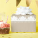 Hermoso papel de envoltura beige y blanco con puntas de polka, rayas y diseño de encaje.