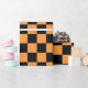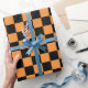 Naranja a cuadros y papel de envoltura negro vibrante y juguetón. Este papel de envoltura es perfecto para agregar un toque de color a cualquier ocasión, ya sea cumpleaños, aniversario, Halloween, o simplemente porque.
