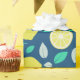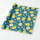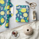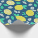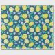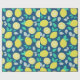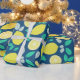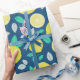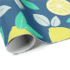 Un patrón de verano de moda de limones amarillos llentos y lonchas de limón rodeados de hojas verde azuladas y de color menta, colocadas sobre un bonito fondo azul marino. Este patrón de cítricos es perfecto para días soleados en verano.