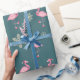 Patrón de Navidades lúdicos con flamencos rosas vestidos con bufandas, sombreros de Santa y botas, rodeados de delicados copos de nieve sobre un fondo verde azulado. Perfecto para una decoración de vacaciones peculiares.