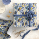 Si se preguntan qué combinaciones de colores elegir para la decoración de sus Navidades y los suministros de envoltura de regalos este año, he creado colecciones de patrones de coordinación para hacer la vida un poco más fácil. Este llamativo diseño acuático presenta arreglos folclóricos con bayas y adornos navideños en azul y oro sobre blanco. Buscar ID1009 para ver otros productos y patrones en este esquema de color.