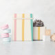 Un patrón impecable con tiras onduladas suaves en una paleta de colores de inspiración vintage de color rojo, amarillo, verde azulado y rosa sobre un fondo crema. Las líneas que fluyen suavemente crean un diseño lúdico y rítmico que evoca un sentimiento de nostalgia. Los colores cálidos y retro de este patrón añaden un ambiente alegre y caprichoso.