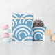 Un diseño minimalista y moderno con motivos de onda semicircular repetidos en blanco sobre un fondo azul. El patrón ininterrumpido evoca un sentimiento de tranquilidad y armonía, inspirado en el flujo y el flujo del océano.