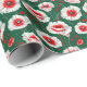 Patrón floral vibrante dominado por grandes flores blancas de amapola con llamativos centros rojos. Las flores están colocadas sobre un fondo verde y rico que aumenta la luminosidad. Junto a las amapolas, los tallos verdes delicados y los pequeños toques florales rojos crean un diseño animado y atractivo desde el punto de vista visual. La composición general es audaz y colorida, evocando un ambiente fresco y natural.