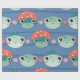 Un diseño encantador y caprichoso con adorables rostros de rana, hongos coloridos y flores rosas sobre un fondo azul profundo, repitiendo con gusto.