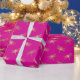 Este papel de envoltura presenta un moderno patrón de libélula de Relieve metalizado de oro falso sobre fondo rosado caliente.