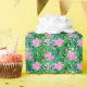 Vector sin fisuras de motivos florales con decoración tropical: grandes flores rosadas sobre el fondo de las siluetas de hojas de palma, arbustos, ramas y follaje de jungla © y ® Bigstock® - Todos los derechos reservados.