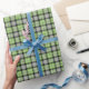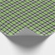 Embalaje de regalo con un recubrimiento verde claro y gris, con resaltes en blanco y negro. Patrón tartán original de Plaidwerx.