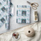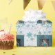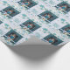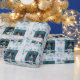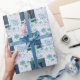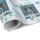 El diseño temático del navidad de la foto en azules con paz y la alegría en purpurina diseñan la fuente de la escritura, copos de nieve del papel azul y un marco del plata y azul adornado con un arco.