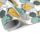 Peines de miel. Patrón geométrico abstracto. Gris, mostaza, figuras turquesas sobre blanco.