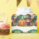 linda bruja de Halloween con su calabaza, escoba y la envoltura de regalo de murciélagos