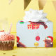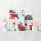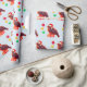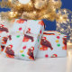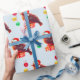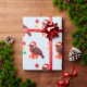 Pequeño pájaro de Navidad lindo parado en una caja de regalo cerca de bolas de Navidades sobre papel de envoltura azul claro de fondo.