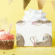 Perro de la mezcla del caniche en un carro de bebé de mimbre pasado de moda con papel de embalaje de la llegada de los amantes del perro de la manta del rosa un nuevo