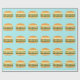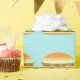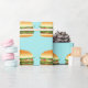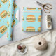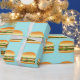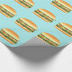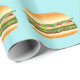 Este papel de envoltura presenta el ilustracion personalizado de una hamburguesa de Destei. La hamburguesa está hecha de carne, lechuga verde, tomates rojos, cebolla, trozos de queso y algunos pepinillos. El bollo parece recién horneado y tiene algunas semillas de sésamo encima. El color de fondo es azul.