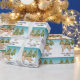 El personalizado original de Destei ilustracion de un lindo perro de raza Golden Retriever amarillo. El perro es colocado en una escena invernal con tres abetos verdes. El fondo es un degradado de azul a blanco que da al diseño ese aspecto frío del invierno. Hay un área de texto personalizable que ahora dice: "¡Feliz Navidad!" junto con un nombre personalizado.