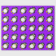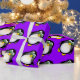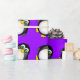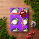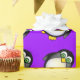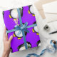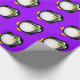 Pingüino lindo estupendo del dibujo animado con los ojos googly verdes en un fondo púrpura. Papel de embalaje perfecto para los cumpleaños del niño.
