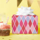 This fun geometric pattern, a traditional harlequin arrangement of diamond shapes, is colored in a romantic theme with pinks, red, and purple. The feminine color scheme is ideal for Valentine's Day gifts, or will delight your little girl or favorite woman on her birthday or any other occasion.