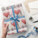 Una niñita en una escalera pinta un gran corazón rojo en una pared de ladrillo con pintura goteando hacia abajo y pinceles en un cubo. Se puede usar para El día de San Valentín, cumpleaños o aniversario.