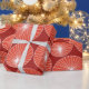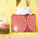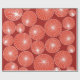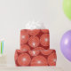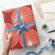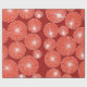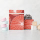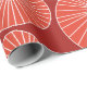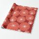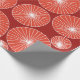 Este papel de envoltura tiene un diseño moderno de mediados de siglo de círculos rojos con estallidos blancos en ellos, todo en un campo de ladrillo.