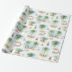Este papel de envolver de Navidades tropicales festivos presenta un patrón de escenas de playa vacacional con palmeras decoradas con hilos de colores y sillas de playa con vistas al agua, intercaladas con flamencos rosas en sombreros de santa, y gaviotas encaramadas en almohadones decorados.