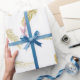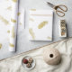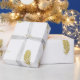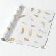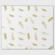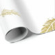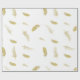 El patrón de envoltura de regalo elegante presenta plumas doradas flotantes sobre fondo blanco