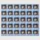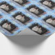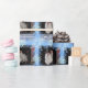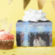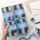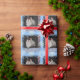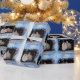 Una foto de un grupo de gallinas blancos y negros que caminan de una entrada del granero en la nieve, anillo por una frontera de copos de nieve azules.