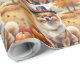Una pintura acuarela de un perro alegre sentado en medio de un montón de hojas caídas vibrantes, rodeado de pequeñas calabazas y bellotas dispersas. El perro lleva un pequeño gorra peregrino y vigas de alegría, capturando el espíritu del Día de Acción de Gracias. Como telón de fondo, los campos de suave cosecha y los árboles de tonos dorados crean un ambiente campestre tranquilo. Las texturas suaves y los tonos cálidos y mudos del otoño le dan al lugar un ambiente acogedor y nostálgico, perfecto para celebrar la belleza de la temporada.