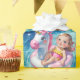A cute young girl gently drifts on a pink and white unicorn float, gliding across a crystal-clear, blue swimming pool.