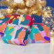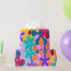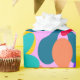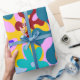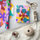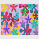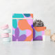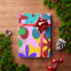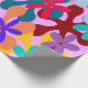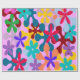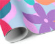 Este papel de envoltura tiene un diseño retro de los años 70 de flores superpuestas en rojo, azul, morado, amarillo, naranja y rojo. Colorido, luminoso y divertido.