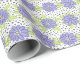 Los rollos de papel de envoltura presentan flores púrpura de lila pastel con hojas verdes de color y pequeños puntos morados oscuros.