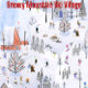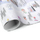 Un papel de regalo de vacaciones animado que presenta un pueblo de esquí de montaña con chalets, esquiadores, visitantes, tenderos, perros y patos, todos bellamente detallados en un patrón repetido sin fisuras. Artista: Bibela