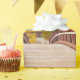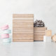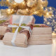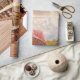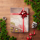 Papel envuelto con una fotografía panorámica. Un puente de madera que conduce a un camino rodeado de árboles que cambian de color.