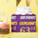 Este diseño de papel envolvente incluye un mensaje como "¡EL CUMPLEAÑOS 63 DE GEORGIANA!", con el "63" con un aspecto de color falso/imitación dorado, y con el nombre y el "CUMPLEAÑOS" en un tipo de letra divertido y audaz. El nombre es personalizable y el fondo es morado. El papel envuelto como este podría ser usado cuando se le dan regalos de cumpleaños a alguien en celebración de sus sesenta y tres años. [~Z0000206]