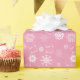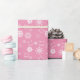Copos de nieve en tonos rosas y blancos sobre este papel de envolver festivo. Entre los copos están las palabras "¡Que nieve!". También disponible en otros colores.