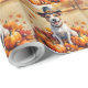 Una pintura acuarela de un perro alegre sentado en medio de un montón de hojas caídas vibrantes, rodeado de pequeñas calabazas y bellotas dispersas. El perro lleva un pequeño gorra peregrino y vigas de alegría, capturando el espíritu del Día de Acción de Gracias. Como telón de fondo, los campos de suave cosecha y los árboles de tonos dorados crean un ambiente campestre tranquilo. Las texturas suaves y los tonos cálidos y mudos del otoño le dan al lugar un ambiente acogedor y nostálgico, perfecto para celebrar la belleza de la temporada.