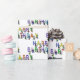 Ratones grises con coloridos textos de cumpleaños feliz sobre blanco. El color de fondo se puede editar.