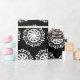 Esta mandala blanca se sienta sobre un fondo negro. Parte de la colección Kowas Mandala.