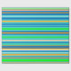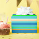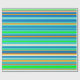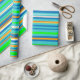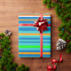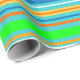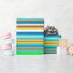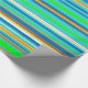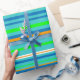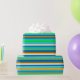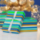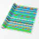 Este papel de envolvimiento colorido está decorado con un patrón vivo de rayas horizontales verdes, doradas, naranjas, azules, turquesas y blancas.