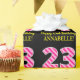 Este divertido diseño de papel de envoltura con temática de cumpleaños presenta un gran número "23", con un patrón de rayas rosa claro y rosa oscuro. También incluye el mensaje "Feliz cumpleaños número 23", y un nombre personalizado. El fondo es negro de color. Envolver papel como este podría ser una manera divertida de envolver un regalo de cumpleaños o un regalo para alguien que esté celebrando su vigésimo tercer cumpleaños. [~Z0000376]